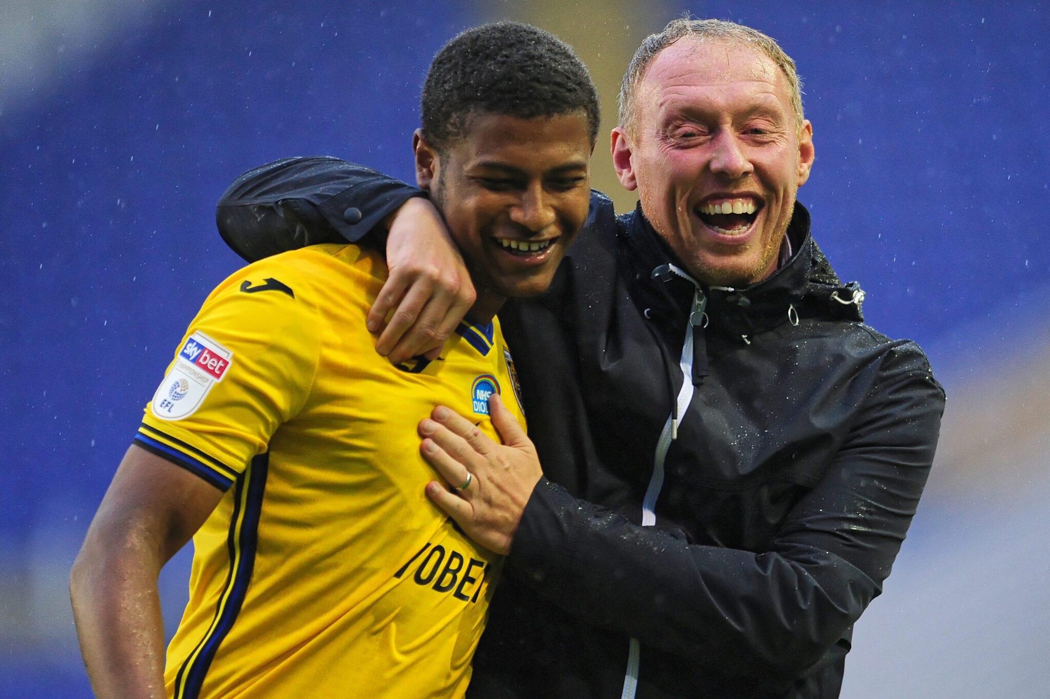 Rhian Brewster of Swansea City celebrates at full time with Steve Cooper Head Coach of Swansea City during the Sky Bet Championship match between Birmingham City and Swansea City at the St. Andrew’s Trillion Trophy Stadium in Birmingham, England, UK. Wednesday 8th July 2020